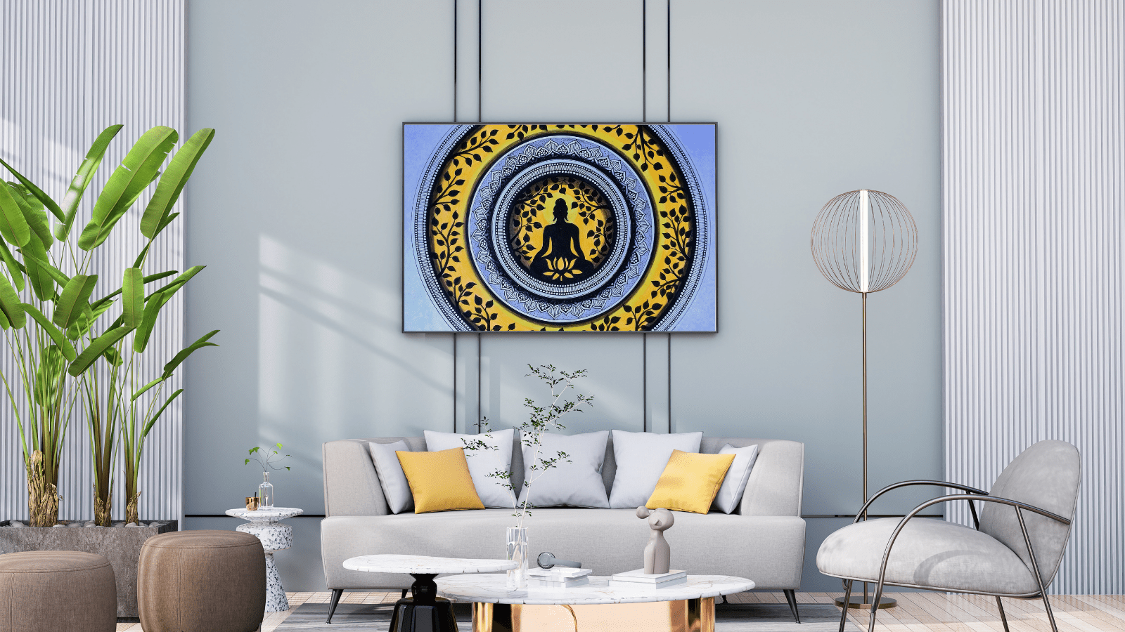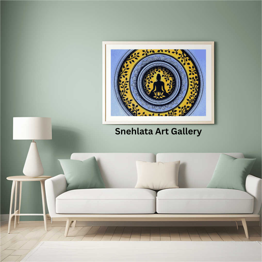 Buddha Mandala Art captures serenity through a black Buddha silhouette seated in meditation, surrounded by intricate sacred geometry. The radiant yellow background symbolizes inner light and awakening, while delicate leafy motifs enhance spiritual harmony. This balanced composition inspires peace, mindfulness, and a deep connection to enlightenment—perfect for meditation spaces and sacred interiors.