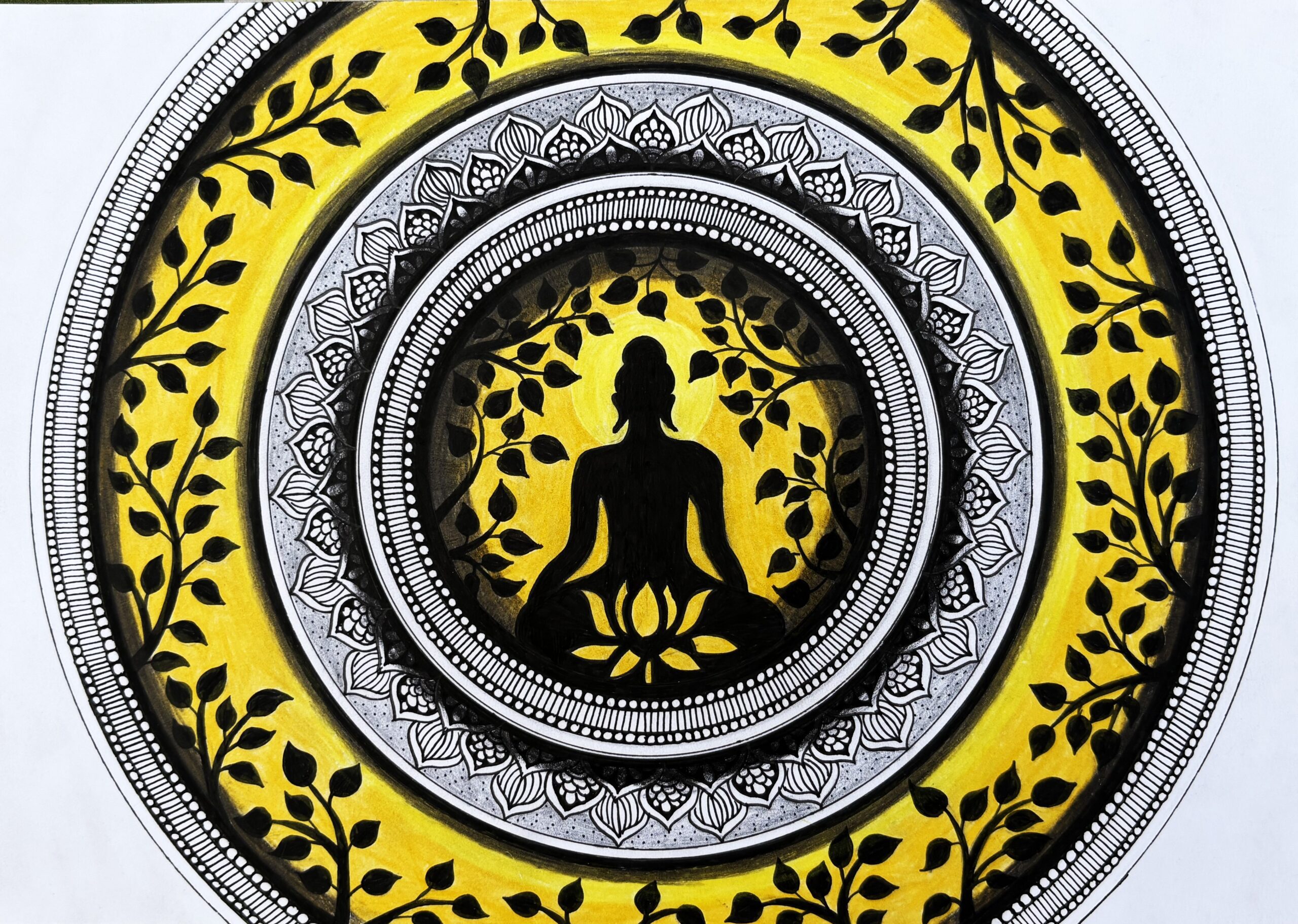 Black Buddha silhouette in the middle with a symbol of deep stillness.