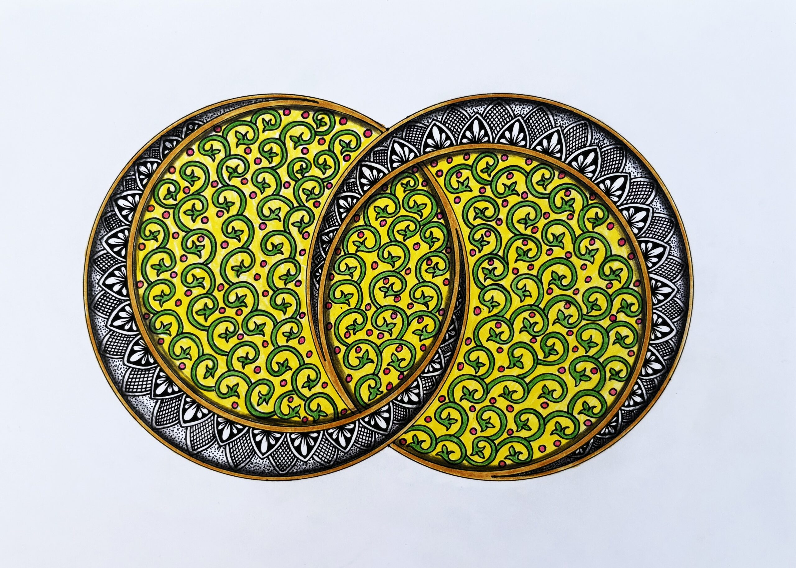 The shapes are framed with golden outlines that provide the artwork with a refined look of a luminous look. The black detailing was contrasted with the bright interior colors, which adds to its three dimensional effect.