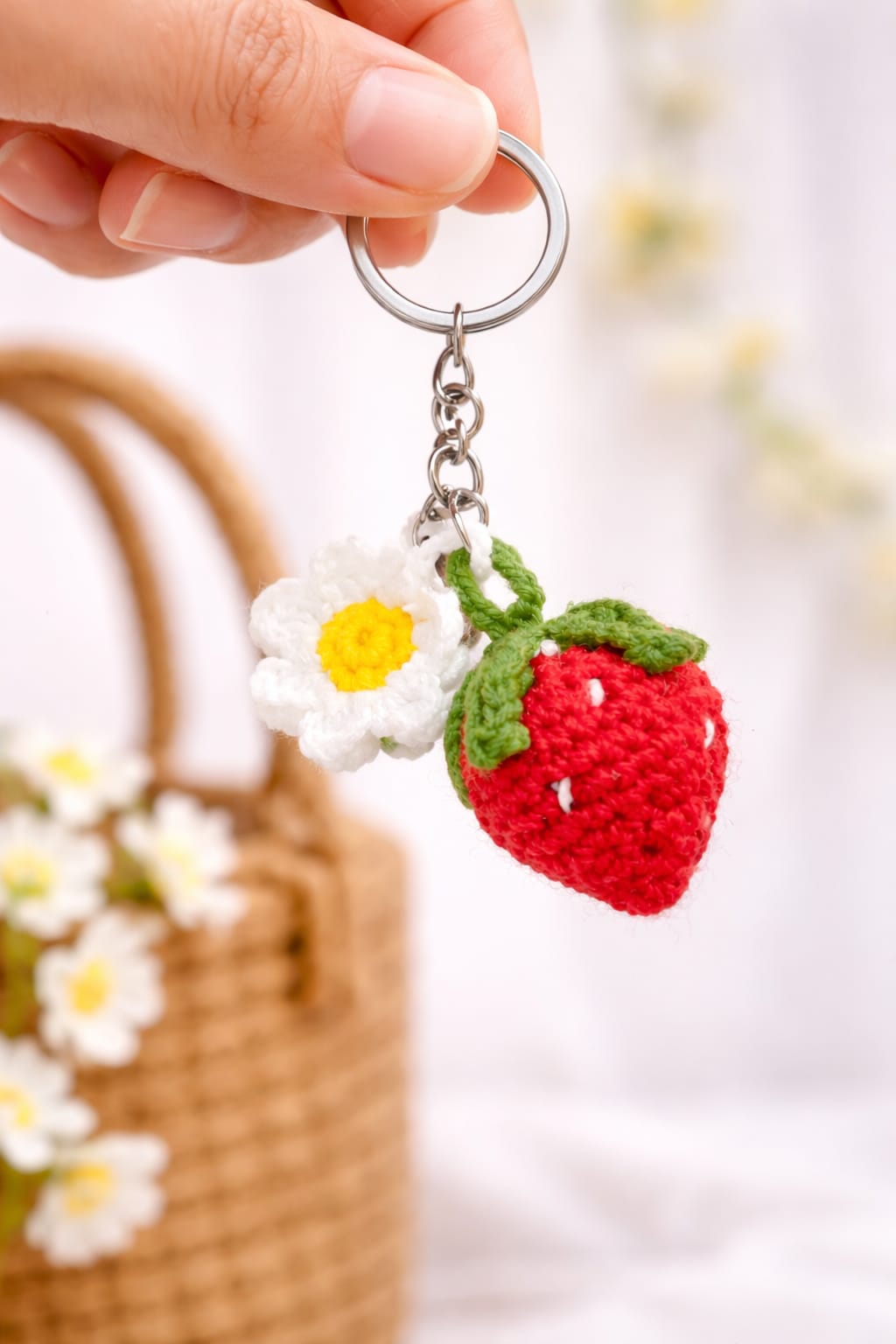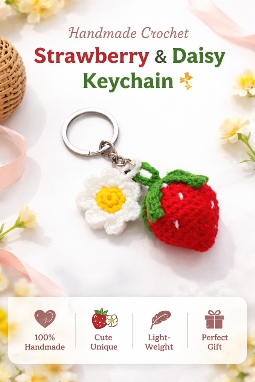Crochet Strawberry & Daisy Keychain by Snehlata Art Gallery (Thread Art by Snehlata) is a handcrafted accessory featuring vibrant strawberry and daisy motifs. Lightweight, durable, and stylish, it adds a playful charm to your keys, bags, or gifts, making it perfect for everyday use and a thoughtful handmade keepsake.