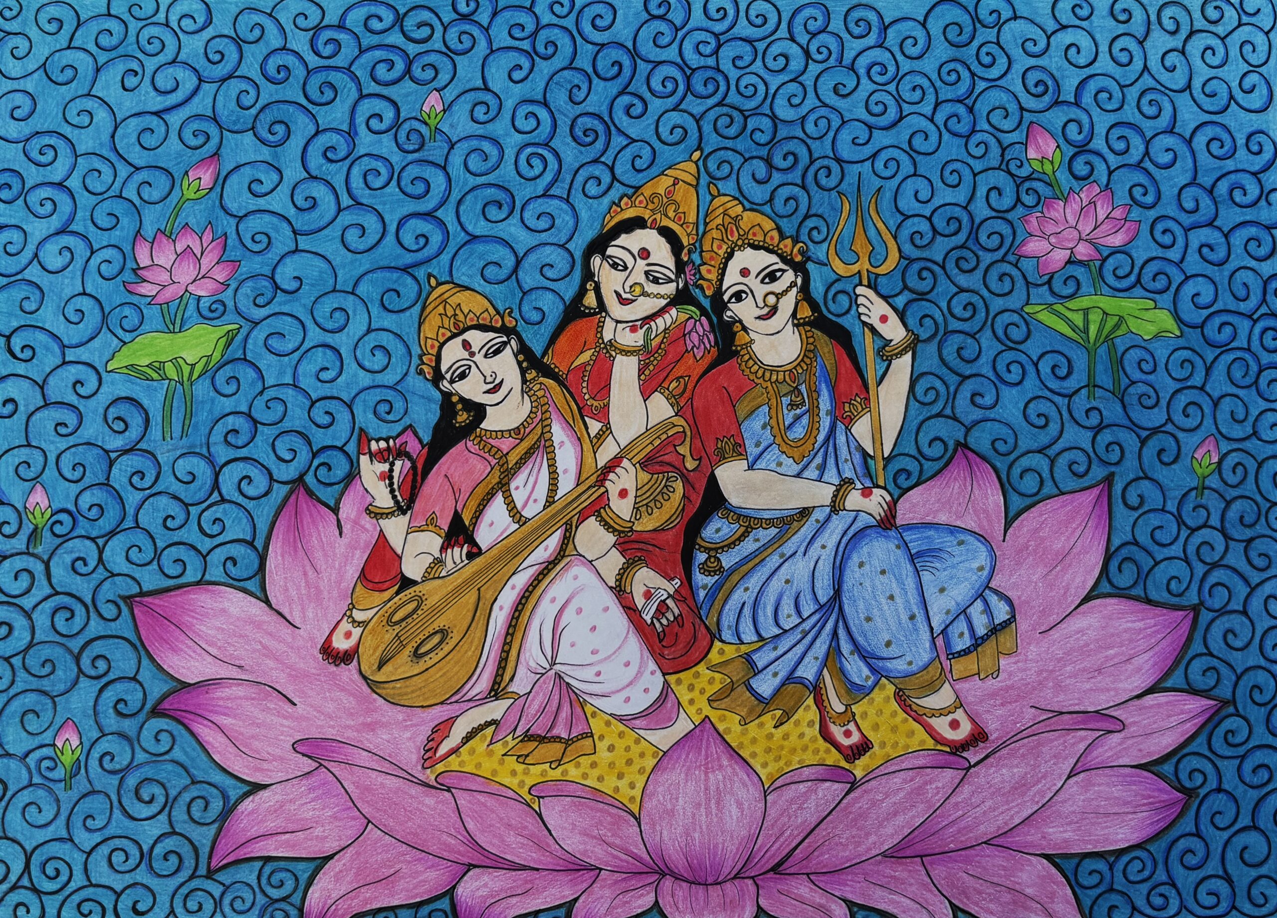 The three goddesses in this colorful painting are depicted with peaceful faces with their traditional clothes, a sign of devotion and prestige. The lotus under them is sacred and represents purity and spiritual awakening and divine beauty born of the struggles of life. The blue patterned background is flowing and it symbolizes the cosmic energy and the infinite universe and adds spirituality to the work.